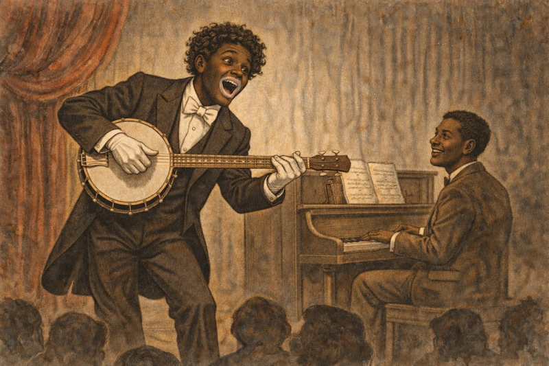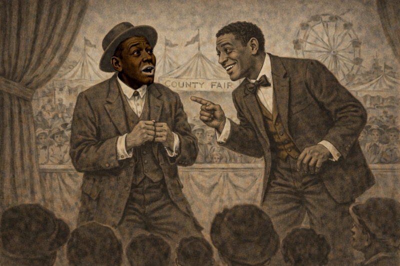 Bert meets George Walker and they partner up. In an early performance, while every white comedian in blackface is getting cheered, Bert and George are booed offstage. With George unwilling to return to the stage, Bert puts on blackface, grabs his banjo, and improvises a song while playing the “coon,” the white-invented caricature of Blackness.
