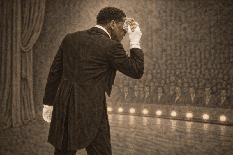 Bert barely makes it through the performance that night, but forces himself onstage for an encore of his signature song. Bert staggers and sweats, removing much of the blackface as he blots his face with a handkerchief. The audience thinks this is part of the bit and, even as Bert collapses to his knees, they laugh hysterically.